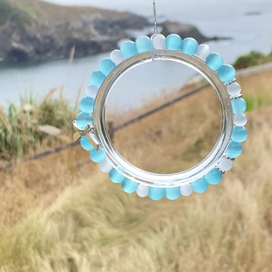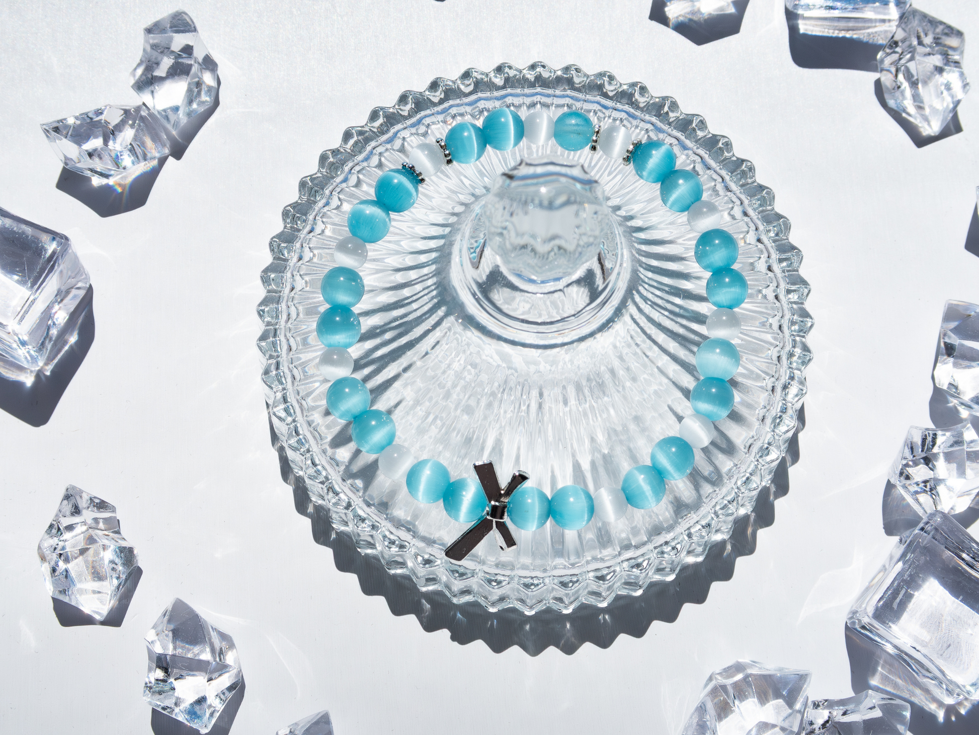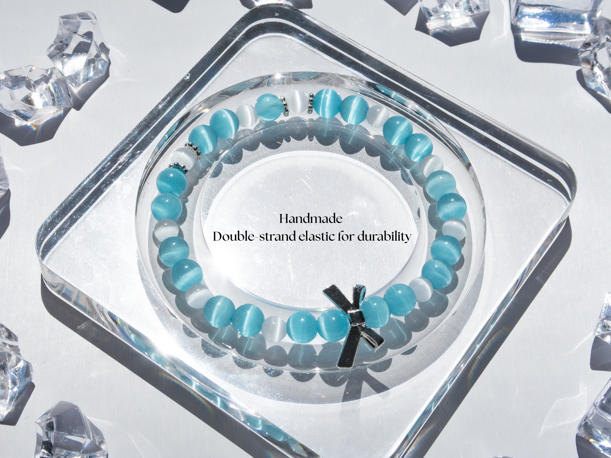 8mm Blue Cat’s Eye with 6mm White Cat’s Eye. Double-strand elastic, bracelet length options 5.5–7.0 in (finished length). Handmade in California.